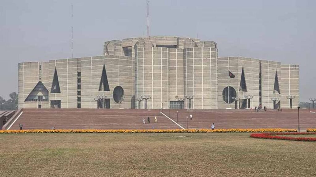 সংসদ ভবনে প্রবেশের গেটটি বন্ধ রয়েছে। ফটকে দায়িত্ব পালন করছেন আনসার ও পুলিশ সদস্যরা। প্রধান সড়ক থেকে সংসদের মূল ভবনের সামনে লোকজনকে কাজ করতে দেখা গেছে।
